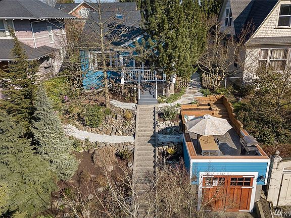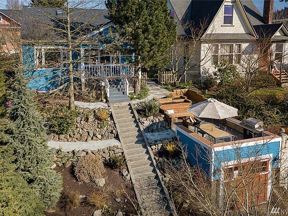 Perched high off the street with views of downtown Seattle, this cozy craftsman is ready for you to stretch out and enjoy the Seattle summer in peace and privacy. A large, fenced back yard features a spa while the front sports an entertainment size deck w/ BBQ, tiered garden space, and private garage wired for electric car charging. Inside, real hardwoods lead to the remodeled bath and kitchen w/ new stainless appliances and granite counters. Potential 2nd bath upstairs. Fresh paint in and out.
