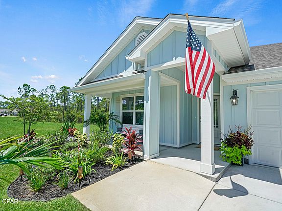The open-concept living room and kitchen area provide an inviting space for gatherings and socializing. The primary bedroom boasts luxury vinyl plank flooring, a lavish en-suite bathroom featuring a double vanity, granite countertops, a separate shower and tub, and a generously sized walk-in closet with ventilated shelving. Step outside to enjoy the beautifully landscaped backyard, complete with a wooden outdoor entertaining deck surrounded by a privacy fence, offering serene views of the wooded area for added seclusion and a large green space adjacent. The home's Hardi-board siding in soft beach colors enhances its coastal allure. Explore Palmetto Bluff, where interconnected sidewalks invite evening strolls and showcase stunning sunset views. Enjoy our exclusive Pickleball Court, perfect for enthusiasts of this popular sport & a playground for the littles. Conveniently situated near Port St. Joe High School. Our property includes a shallow well for efficient irrigation, ensuring lush, vibrant landscaping year-round. Discover the perfect balance of privacy, comfort and community in Palmetto Bluff. Schedule a private tour today and experience why this coastal haven is your ideal home.