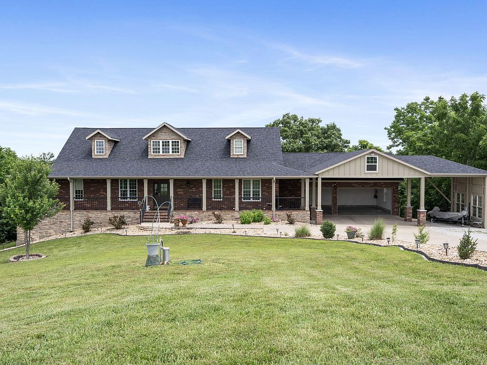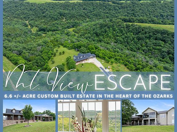 Perched high above the rolling hills & valleys of the Mark Twain National Forest and Table Rock Lake, this like-new custom estate offers truly cinematic sunrise and sunset views that will stir the emotions & bring rest to the soul each & every day. Situated on a private 6+/- acre setting, this generational retreat is designed for unforgettable gatherings, everyday luxury, & total serenity.Crafted w/ intention & extraordinary detail, this unicorn multi family home features three potential owner's suites--one on each level--plus two gourmet kitchens, a year-round glassed-in sunroom w/ panoramic views, & expansive living spaces flooded w/ natural light. The main level showcases a formal dining room w/ coffered ceiling, rich hardwoods, cozy gas fireplace, & an open-concept chef's kitchen w/ granite counters, custom cabinetry, island, stainless appliances, & space for every kind of celebration. A spacious spa like primary suite, two guest bedrooms w/ Jack & Jill bath, & attached 3-car garage+bonus carport complete the main level. Upstairs features a luxe suite w/ private living space and another spa-like ensuite w/ bath & more mountain views. Take the whole tribe downstairs to enormous rec room w/ 2nd fireplace & second full kitchen/dining, two more spacious beds w/ private en-suites, & bonus office space-perfect for multi-gen living or extended guests. From there walk outside to expansive covered patio space & submerge yourself in nature w/ endless stargazing, the sound of whippoorwills in the distance & cool evening breezes. Bonus! Discover adorable ready to complete glamping shed w/ mini-split, ready to become craft/hobby space or high end playhouse for the kiddos!And the location! 10+/- min to Walmart, Reeds Spring Schools, & Wolf Pack Park (hiking, biking, pickleball), 15 min to SDC, & 30 min to Branson entertainment, shopping & dining. New cherished memories await in the rolling ozark hills--just min from the lake action @ 358 Spring View Pl