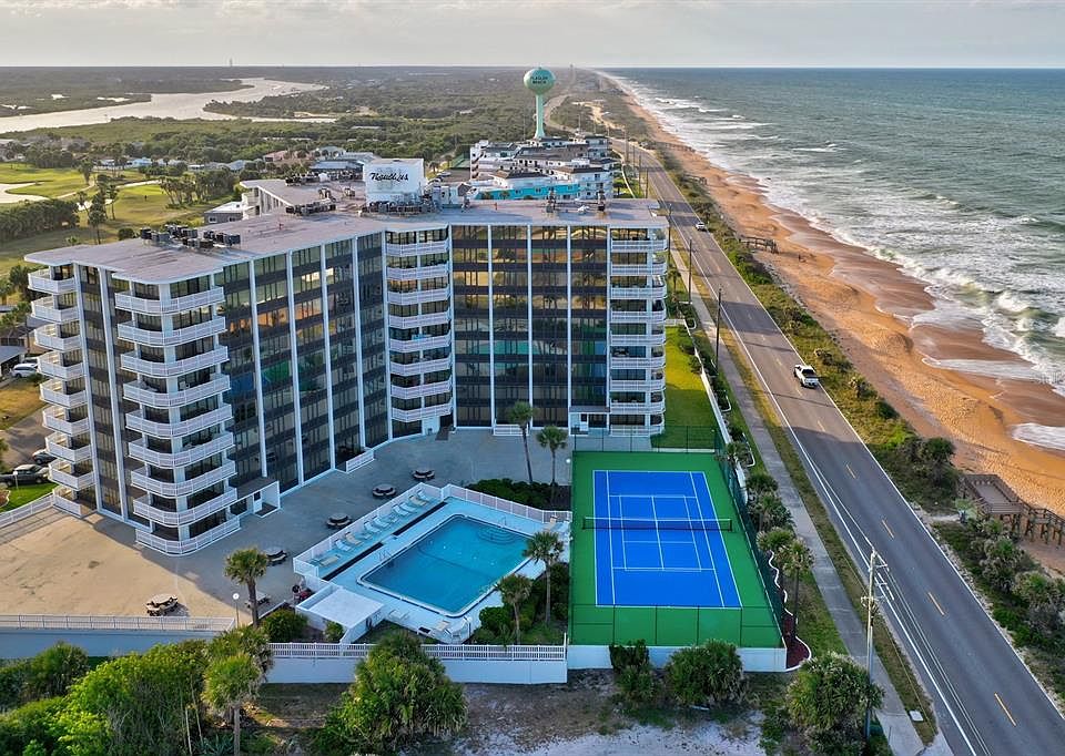Escape to coastal paradise at the Nautilus Condos, a highly sought-after resort-style building perfectly positioned directly across scenic A1A from the golden sands and turquoise waters of Flagler Beach one of Florida's last authentic, uncrowded beach towns. This rarely available, beautifully remodeled 2-bedroom, 2-bath corner unit on a high floor delivers the ultimate in open, light-filled living with a spacious wrap-around balcony that captures sweeping northern and western views, including nightly sunsets painting the sky over the serene Matanzas River and Intracoastal Waterway. Recently updated throughout, the condo boasts a modern chef's kitchen with gleaming granite countertops, stainless steel appliances, abundant cabinetry, a large breakfast bar, brand-new luxury tile flooring in a coastal palette, fresh paint, updated bathrooms with contemporary vanities and fixtures, generous closet space, and an open-concept living/dining area ideal for entertaining or simply relaxing while listening to the distant waves. Delivered unfurnished with only minimal entry fees, this move-in-ready residence offers incredible flexibility and immediate occupancy. Residents of the Nautilus enjoy an impressive array of amenities designed for the Florida lifestyle: a spectacular oceanfront pool deck with panoramic Atlantic views, tennis and pickleball courts, a fully equipped fitness center, secure underground parking, private locked storage, elevators, on-site management, and beautifully maintained grounds. Step out the back of the building and your moments from Gamble Rogers State Park, where you can fish, kayak the Intracoastal, hike nature trails, or camp under the stars. Five minutes to the heart of laid-back Flagler Beach with its oceanfront restaurants, local boutiques, weekly farmers market, and iconic fishing pier; 25 minutes north to the nation's oldest city, historic St. Augustine; 25 minutes south to world-famous Daytona Beach and the Daytona International Speedway for racing events, Bike Week, and vibrant boardwalk energy; and just an hour to Orlando's theme parks. Call today for your private showing and start living the beachfront dream you've always wanted!