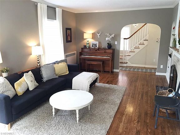 Exceptional brick colonial with beautiful architectural detail! The living room has a stunning carved stone fireplace surround as well as built-ins, expansive windows and arches that open to the foyer and dining room. The spacious formal dining room (and living room) has refinished hardwood floors. The eat in kitchen offers newer stainless steel appliances, porcelain farm sink, lighting, butcher block counter tops and a fun backsplash! The first floor also has a mud room with newer ceramic tile floors, windows and a wood ceiling. The half bath with a newer floor tile complete the first floor. The 3 bedrooms on second have beautiful refinished hardwood floors. The oversized master bedroom has a private half bath as well as large windows. The large full bath has classic black and white tile. The third floor suite has a full bath with a new (2016) claw foot tub and a cozy space for guests as well as extra storage. The lower level has a club room with a fireplace and plenty of room for exercise equipment or family fun! Newer electrical panel. Boiler 2016. Many new light and plumbing fixtures. Fresh paint throughout! This house has been lovingly cared for by it's owners! Walk to the park or shopping! Minutes to the Clinic, Case or University Circle. Great access to 480! You won't be disappointed!