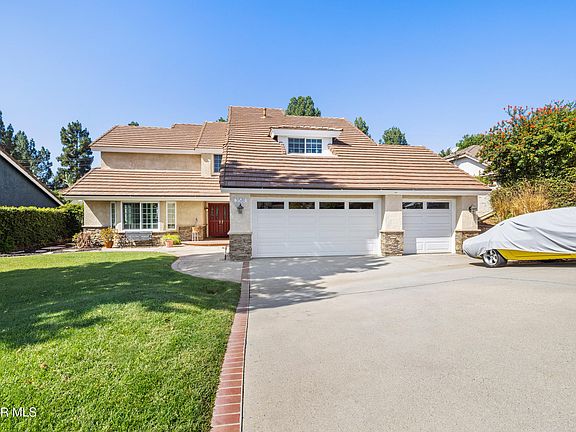 SoCal Living at Its Finest - Private Pool, Owned Solar & Prime Location! Welcome to your dream home tucked away on a quiet cul-de-sac in one of Simi Valley's most desirable neighborhoods! This beautifully maintained, move-in ready 4 bedroom, 2.5 bath residence offers the perfect blend of comfort, style, and energy efficiency. Step inside to gleaming wood floors, soaring beamed ceilings, plantation shutters, and an abundance of natural light. The inviting living room features a charming bay window, while the formal dining area is ideal for entertaining. A cozy family room with a fireplace and wet bar creates the perfect gathering space. The remodeled chef's kitchen is a standout, showcasing granite countertops, a designer tile backsplash, stainless steel appliances, walk-in pantry, and a sunny breakfast nook. Upstairs, the spacious primary suite offers a true retreat with cathedral ceilings, a second fireplace, dual sinks, soaking tub, separate shower, gorgeous tile floors, and a large walk-in closet. Enjoy the ultimate Southern California lifestyle in your private backyard oasis—complete with a sparkling pool and waterfall, separate above-ground spa, fire-pit, and two covered patios for outdoor living and entertaining. Additional features include: Direct access 3-car garage, owned solar system (18 panels, 8 kW) with ultra-low utility bills, copper plumbing, NEST thermostat & RING security system, dual-pane windows and doors, tankless water heater, Central HVAC, recessed lighting, abundance of storage, plus exterior with new stone siding and stucco. This home truly has it all - location, upgrades, energy savings, and space to relax. Properties in this neighborhood are rarely available—don't miss your chance!