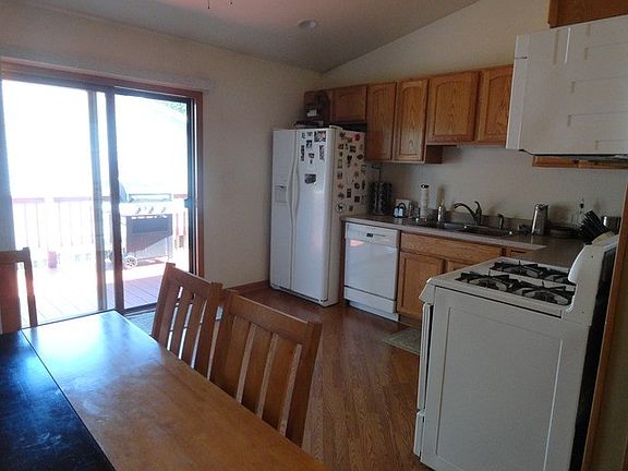 Wonderful contemporary bi-level home with vaulted ceilings & wood floors. Country kitchen with pantry. Living room with built in shelves. Large lower level family room. Master complete with ceramic tile bath & walk-in closet. Modern light fixtures & ceiling fans. Huge wrap around deck...ideal spot to relax. Fenced yard and attached 2 car garage. Close to shopping, lakes & major roads. Spotless home. Move-in ready.