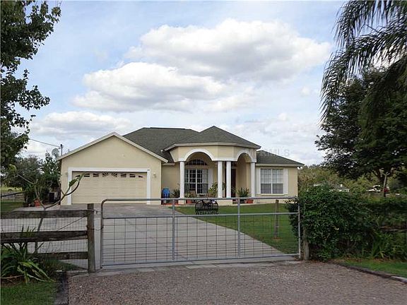 Country Living at its finest, yet close to everything! 4 Bedroom/2 Bath/2 car garage home located on Corner Lot on over 5 Acres of land! Bring your Boat and/or RV! Very LOW HOA Dues! This property and home have been beautifully maintained. Backyard offers gardening beds, fire pit, Exterior generator hook up, Beautiful Blueberry plants leading to separate, 10X10 shed w/ roll up door for easy access. 5 stall barn that has water, electricity, drive gate, 6x6 posts &Brick Pavers! Red top, Hot-wired Fencing around entire 5 acres. Interior of Home is Move in Ready, boasts 11ft ceilings, Archways, Ceramic tile throughout and offers plenty of natural light. To the left is the 4th bedroom/Office w/ Double glass doors. To the Right, are 2 spacious bedrooms sharing a Full bathroom with tub/shower. Family Room has pocket sliding glass doors leading to spacious Lanai. Kitchen offers recessed lighting, plenty 42"cabinets, w/ ALL KITCHEN APPLIANCES INCLUDED w/ eating space in kitchen. French Doors leading to spacious Master bedroom w/ his and her walk in closets. Master Bathroom has large Garden tub w/ separate large, walk in shower stall and dual vanity sinks. Horse &/or Land Lovers Paradise! Make this home yours today!