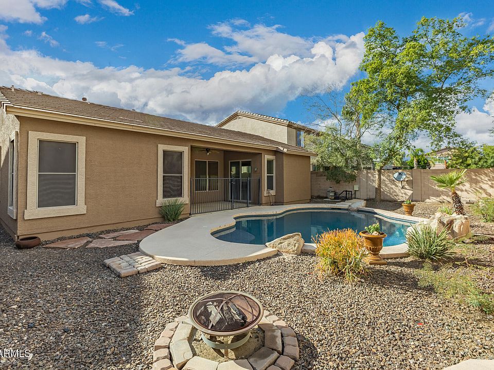 Gorgeous split floor plan home with sparkling pool in the highly desirable Tramonto community! Perfect north Phoenix location—easy freeway access, close to dining, shopping, entertainment, and just minutes from the new TSMC facility. Bright, open layout features large living and family rooms ideal for entertaining, plus a comfortable den. Beautiful eat-in kitchen with rich cabinetry, gleaming stainless steel appliances, and a large island with breakfast bar. Spacious primary suite offers a huge walk-in closet and elegant bath with dual sinks, new fixtures, separate tub and shower. Private backyard with no neighbors behind, refreshing pool, newly resurfaced, with water feature, beautiful desert landscaping, and large covered patio—your own peaceful retreat! Secondary bedrooms are all bright and spacious; fourth bedroom could serve as an ideal, private home office. Large laundry room with built in storage cabinets for added convenience. Home exterior is newly repainted, roof was completely redone in 2024, new microwave and dishwasher installed this year! Washer, dryer, and water heater all replaced in 2022, new pool pump installed in 2023. Truly a wonderful home in an ideal north Phoenix location!