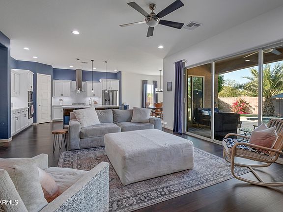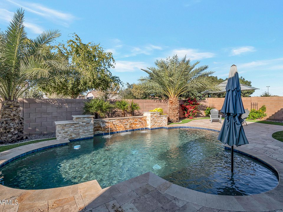 Arizona lifestyle at its best! This stunning single-story home in the highly sought-after community of The Bridges at Gilbert offers 3 bds plus a bonus room, 2.5 baths, & a resort-style backyard perfect for entertaining or relaxing. Bright, open floor plan featuring spacious entryway leading to upgraded kitchen & great room. Kitchen boasts lrg quartz island w/ bar seating, ss appliances & vent hood, gas cooktop ample cabinetry & generous walk-in pantry. Enjoy seamless indoor/outdoor living w/ 3-panel sliding glass wall opening to the covered patio. Split floor plan includes lrg primary & bath featuring dual vanities & dual shower heads. Additional interior upgrades include plantation shutters, 8' panel doors, and continuous flooring throughout. Outside, your private oasis awaits. Travertine-tiled patio w/ TV, pebble-tec play pool w/ waterfall feature & baja shelf, gas stub for bbq, synthetic grass, and lush landscaping w/ no houses on one side or behind. Additional upgrades include paver courtyard 3-car tandem garage, new A/C & 1 yr-old pool pump. Located in the picturesque lake community of The Bridges at Gilbert, you'll enjoy multiple parks, playgrounds, tennis & basketball courts & splash pad, all just minutes from premier shopping, dining, golf, & freeway access. Don't miss your chance to own this exceptional home & the Arizona lifestyle you've been dreaming of!