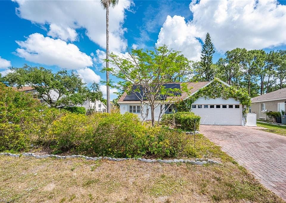Spacious and Bright 3 bedroom, 2 bath partially furnished home in Queens Park with a beautiful private back yard that expands into the Queens Park preserve area behind the home too. The master bedroom is on the ground floor and there is an updated kitchen. The lanai area is screened in and there is an oversize 2 car garage! The current flood policy is assumable!! Brand new roof and a leased solar system from Sunrun is installed and starting to work, current cost $117 monthly. Close to downtown Naples and the beaches. LOW HOA fees too!