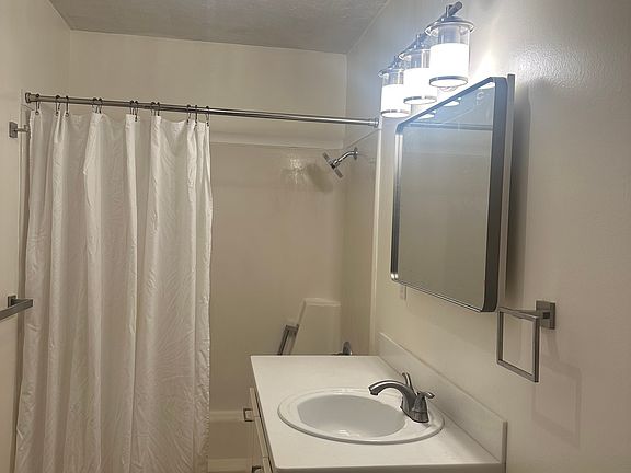 - Renovated bathroom with new custom built vanity, Corian countertop, large mirror, medicine cabinet, rainfall showerhead, new stainless steel towel bars, and grab bar in the tub and shower
