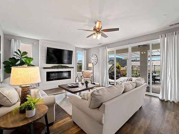 This sophisticated residence boast a captivating Jr. Suite with its own entrance, complete with a living room, full bathroom, laundry closet, and bedroom with a walk-in closet an exceptional addition to the main house. This home ensures impeccable condition throughout. The main entry courtyard showcases stamped concrete. The home is designed to be energy-efficient. You’ll appreciate the upgraded Solar panels, they are Owned not leased. Inside, you'll discover a gourmet kitchen complemented by a spacious great room and breakfast nook. The residence offers numerous upgraded amenities such as a double wall oven, fireplace, a generous kitchen island, pendant lighting, recessed lighting, and a loft. Ceiling fans and luxury vinyl plank flooring adorn the first floor.The primary bedroom suite offers a deluxe shower with a built-in bench, an oversized walk-in closet, and a balcony with picturesque mountain views. A separate soaking tub adds to the relaxation experience. The property also features a tandem 3-car garage with an electric vehicle outlet, along with covered backyard and front porch areas, adding to its allure.Other features include 60 amp sub-panel for jacuzzi, electric receptacles ad plumbed for outdoor BBQ, California room, automatic irrigation, low maintenance yard, & alumawood patio covers w/ceiling fans and recessed LED lighting.
