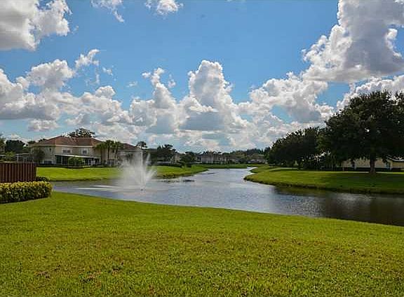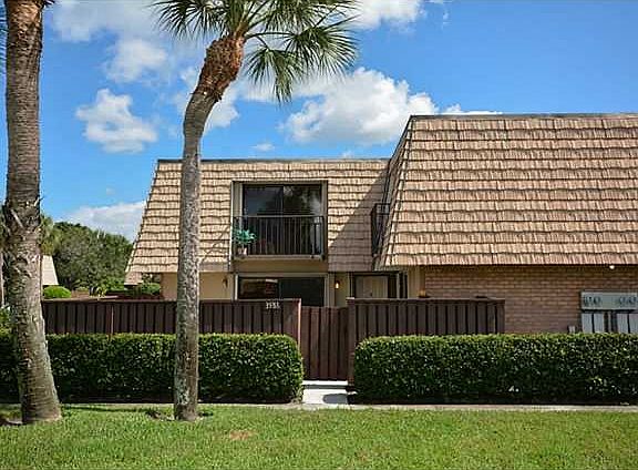 Spectacular Townhome in Sunset Trace! Private location near lake with great views. Huge fenced patio area with plenty of room to entertain, BBQ and enjoy the outdoors. Updated kitchen with stainless steel appliances! Beautiful tile throughout living areas and carpet in bedrooms. Both bedrooms have sliding glass doors and a balcony! Gated community centrally located in Palm City with 2 pools, playground, tennis, sidewalks, street lights, and more.
