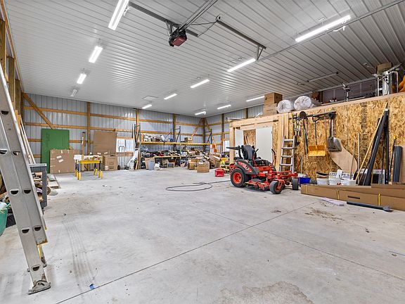 This one-of-a-kind property offers the perfect blend of lifestyle, convenience, and opportunity. Set on a spacious 3.24 acre lot, the home features a 1,920sf(40x48) outbuilding designed for endless possibilities-ideal for a professional workshop, equipment storage, auto collection, training facility, or recreational use. Inside the residence you'll find luxury and modern convenience in this walkout ranch built in 2020. Open design and tall ceilings. Large windows bring in abundant natural light. Chef’s kitchen with professional-grade Thermador appliances, 10' island, cloud lighting, walk thru butler's pantry. Primary suite with lighted tray ceiling, heated bathroom floors, soaking tub, and spacious walk-in tile shower. Entertainment haven walkout lower level featuring a wet bar with huge island, pool table stays, theater room, additional bedroom and bath. Outdoor covered deck with infrared heaters and tv, 2nd open deck with access to primary suite, wired and supported for hot tub, both are maintenance-free composite. Garage with epoxy Geothermal heating and cooling, a 16.8kw owned solar system, and zoned systems to keep utility costs low. What sets this property apart is the expansive outbuilding/shop with oversized door and versatile space. Easy access to the interstate-commute, travel, or operate your business with ease. Rare opportunity for live/work setup, hobbyist space, or private athletic training. Excellent value compared to similar estates further from the highway!