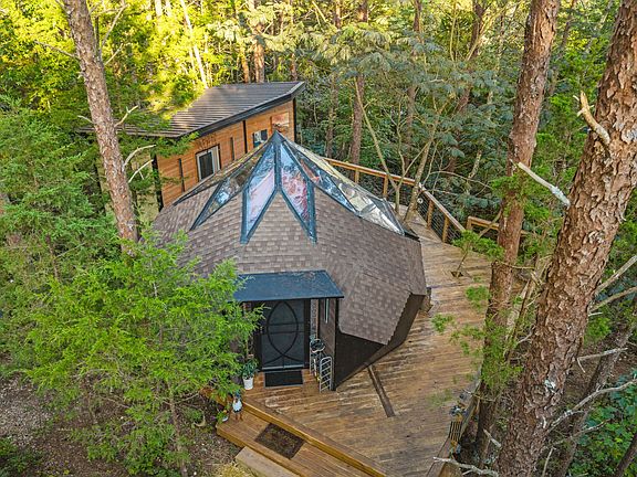 Perched high on the hill with beautiful local views, the property's centerpiece is a 20-foot circular custom geometric dome. Connected by wood decking, it opens to a charming bathhouse and dressing area, creating an enchanting and functional space.