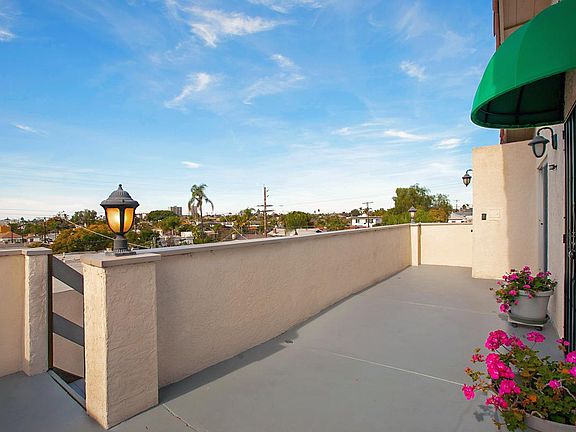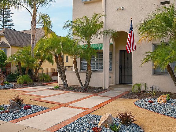 This upstairs unit has an east facing sunrise deck and a west facing sunset deck. It has a great cook's kitchen black quartz countertop, trash compactor, DW, 30 gas range, microwave, disposal, filtered water at sink, soap dispenser. It also includes: Separate dining area Two bedroom/two full baths Dark oak-like laminate flooring, except tile in baths Gas-log fireplace with exhaust fan in Living Room Connect TV above fireplace mantel Skylight in hall bath Cox cable throughout Security system in place (optional) One-car garage with remote/built-in storage Private courtyard access to garage Community laundry onsite shared between 3 units Quiet Triplex. Plenty of guest street parking Two blocks from Morley Field North Park eateries/bars a short walk away Near 805 and 163 freeways Incredible views Save gym membership and use the stairs Five minutes to downtown via Pershing Drive Owner pays water