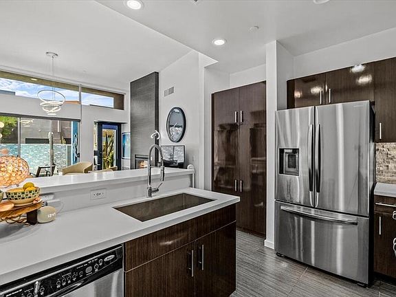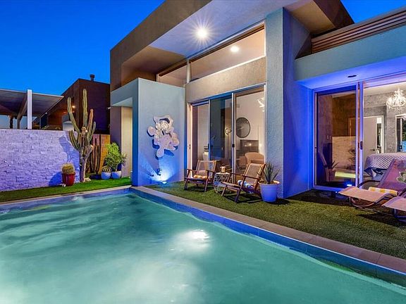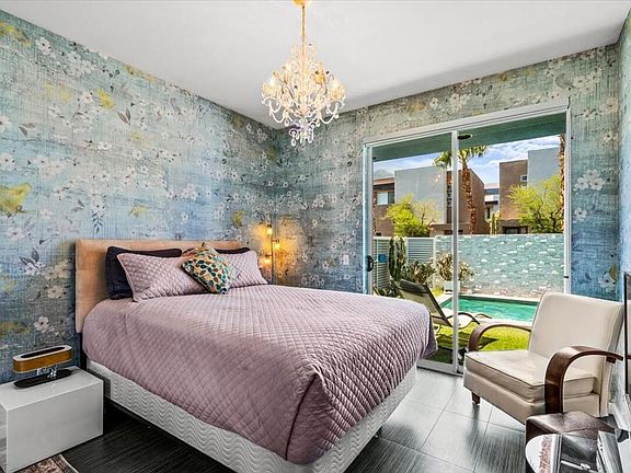 Rare single-level villa with private saltwater pool in Palermo!One of only six of its kind, this stylishly renovated 2-bed, 2-bath corner-lot home offers seamless indoor-outdoor desert living.This light-filled home showcases high-gloss zebrawood cabinetry, porcelain tile flooring, soaring 14-ft ceilings, and a modern kitchen with white counters and a quartz natural stone backsplash. A double-sided gas fireplace connects the open living area to the spacious primary suite with a spa-like bath and mosaic walk-in shower.In addition to two bedrooms, there's a versatile flex space--perfect for a desk, reading nook, or creative corner. In 2025, the home received fresh designer wallpaper, updated light fixtures, a new A/C, and Rayne water filtration system with 28-day service cycles (transferable to the buyer). The pool pump was replaced less than two years ago, and a new saltwater cell was installed this year. In 2024, a new washer, dryer, and refrigerator were added.Set on a prime corner lot with added privacy and natural light, the property's private Pebble Tec saltwater pool is a rare find in Palermo. Community amenities include two pools, two spas, a gym, and a clubhouse--all just minutes from downtown Palm Springs, shopping, dining, and golf.