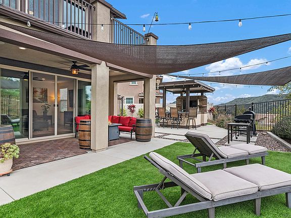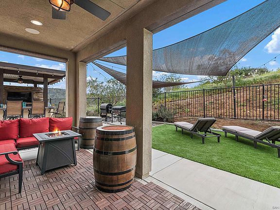 Potential Rate Buydown! This stunning 4-bedroom, 3.5-bath, 3,205 sq ft two-story home is located in the highly sought-after Horse Creek Ridge community of Fallbrook. Built in 2021 and set on a 7,575 sq ft lot, this beautifully upgraded home offers luxury, comfort, and energy efficiency. Step inside to find luxury plank flooring on the main level, tile in all bathrooms, and plush carpet upstairs. The gourmet kitchen is a chef’s dream, complete with granite countertops, an oversized island that seats five, double ovens (one with built-in convection and air fryer), and a butler’s pantry with an additional walk-in pantry. The open-concept living area flows seamlessly outdoors through center-open sliding doors, leading to a private backyard oasis with an outdoor kitchen, TV hookups, built-in speakers, and a 5-person spa with waterfall feature, perfect for entertaining or relaxing. The primary suite offers a tranquil retreat with its own private balcony and a spa-inspired bath. Additional upgrades include: Solar (NEM 2.0), EV charging hookup, 8’ Roman-style interior doors, Ceiling fans & whole house fan, Water softener & filtration system, Security system, Low-maintenance landscaping, Low HOA fees. This exceptional property blends thoughtful design, smart home features, and resort-style outdoor living. Don’t miss your chance to call this home.