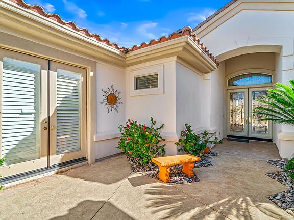 Del Webb - Sun City Palm Desert. Discover the highly sought-after Monaco floor plan, featuring two primary suites and two-and-a-half bathrooms--ideal for embracing the relaxed desert resort lifestyle. Enter through a gated courtyard and decorative glass double doors into the expansive living room, where wall-to-wall windows and sliding doors showcase serene views and provide seamless access to the back patio and yard. With the exception of the living room, the home is tiled throughout. A formal dining room adjoins the main living space, while the kitchen impresses with granite counters, a large prep island with breakfast bar, gas cooktop, double ovens, and ample cabinetry--all framed by a picture window overlooking the tranquil backyard. The kitchen flows effortlessly into the family room and breakfast nook, both offering direct patio access. The primary suite serves as a spacious private retreat, complete with a bay-window sitting area with sliding door, soaking tub, separate shower, walk-in closet, and dual sinks with a convenient sit-down vanity. The extended guest en-suite features its own full bathroom and private entrance from the gated courtyard--perfect for visitors or extended stays or a second primary bedroom suite. A well-equipped laundry room includes a utility sink, folding counter, and ample storage cabinetry. The two-car plus golf cart garage offers additional storage options. Enjoy the lushly landscaped backyard, thoughtfully designed for privacy and low maintenance. Special highlights include an extended patio with alumawood overhang, a babbling brook water feature, and shutters on nearly all windows and sliders. One A/C unit was replaced approximately two years ago.