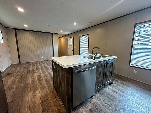 The open-concept living room and kitchen are beautifully color-coordinated, accented with just the right touch of shiplap for a sizzling style. The living room also boasts three decorative windows—an eye-catching detail that completes the look.