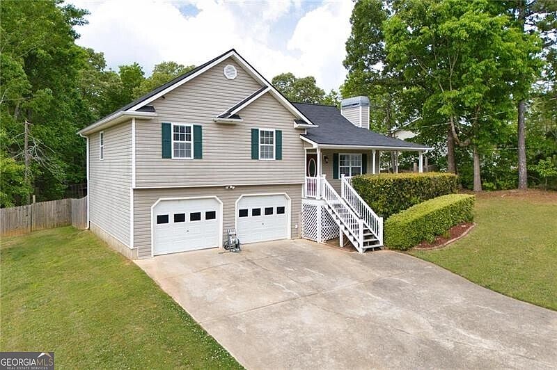 Beautiful 3-bedroom 2 bath home offering Acacia accent wall and Black Walnut mantle over the fireplace in the living room as you enter the home. Custom bookcases surround the fireplace. Stainless steel appliances include gas range, microwave, dishwasher, and refrigerator. LVP flooring throughout the home, ceiling fans in each bedroom, and lots of storage space. The secondary bath was renovated and features Carrera walk-in shower with seat, spa style double shower heads and sprayers. Porcelain floors, shiplap ceiling and custom vanity featuring lighted and heated mirror. Custom vanity offers shelving with Cherry top and vessel sink with waterfall faucet. The primary suite offers his/her closets, walk-in shower, and ceiling fan. Oversized 2 car garage with large storage area with separate air conditioning. Inviting front porch for relaxing after a long day. Spacious level fenced backyard surrounded by trees for complete privacy. HVAC unit for upper level replaced in 2023, new roof in 2021. Quiet community with no HOA dues located just off 278 for easy access to Hiram, Rockmart, Marietta, and Atlanta.