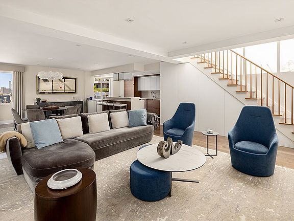Spanning 2,536 square feet of interior space, the penthouse has four bedrooms and an additional large office and recreation room on its upper level, in addition to the huge living and dining room on its lower level. Handsome white oak flooring with a walnut stain and designer finishes are throughout, and the home enjoys excellent light from all four exposures.