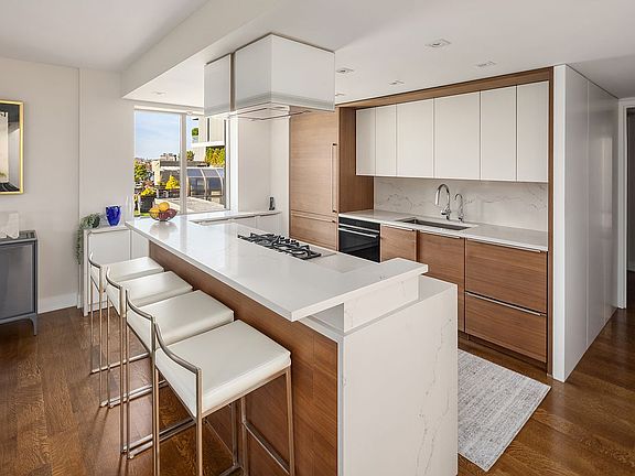The windowed open kitchen features handsome clear-finished walnut and white cabinet faces and abundant counter and storage space. The large island has a marble waterfall and vented Fischer Paykel cooktop, along with an under-island spice rack and room for four stools.
