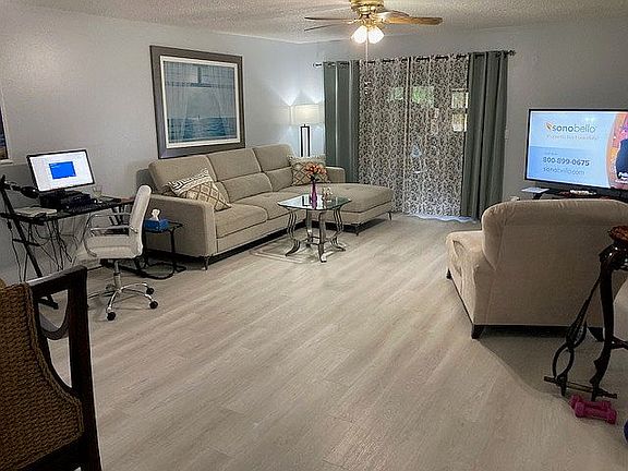 Beautiful ground floor unit with the best landscaping in the complex front and rear! This is NOT a 55+ community, but based on the residents and how quiet it is you would think it is one. Just a few steps from your ASSIGNED CARPORT on your private unshared walkway to the front door with no stairs to climb. Front porch and a rear porch large enough for a grill and seating. Neutral color vinyl flooring throughout. In 2023 whole condo painted and a NEW RHEEM AIR CONDITIONER with blue light installed. Bright eat in kitchen with window, large pass through opening to living/dining room and NEW STAINLESS LG APPLIANCES. Large living dining room with large sliding glass door to lanai with glass windows and screens. Large master bedroom in back of condo with 2 WALK-IN CLOSETS, direct access to REMODELED MASTER BATH with NEW vanity and sink, beautiful shower with sliding glass doors and linen closet. Second bedroom in front of condo separated from the master bedroom by a second bathroom with a tub/shower and LAUNDRY ROOM. HOA fee includes: Cable TV, INTERNET, water, trash, exterior maintenance, lawn mowing and community POOL with covered patio area. I have lived here 8 years and have enjoyed it, but my daughter just moved to South Carolina and I want to relocate there to be close to her and my grandchildren.