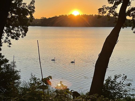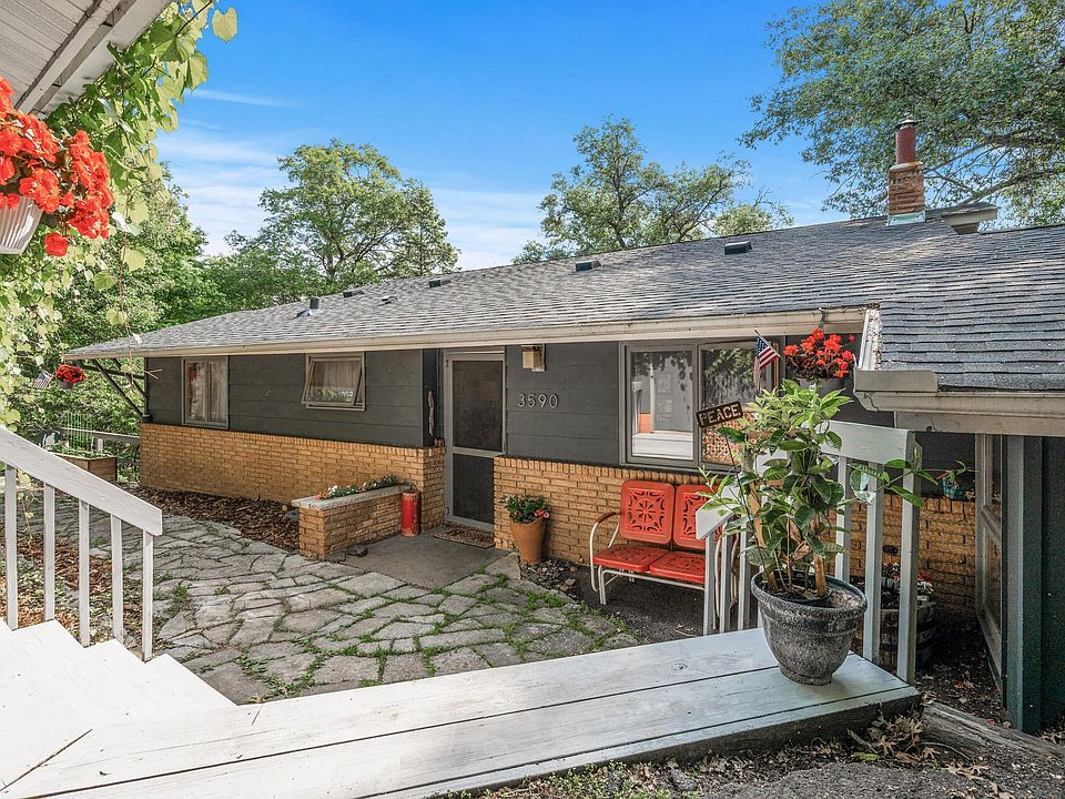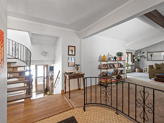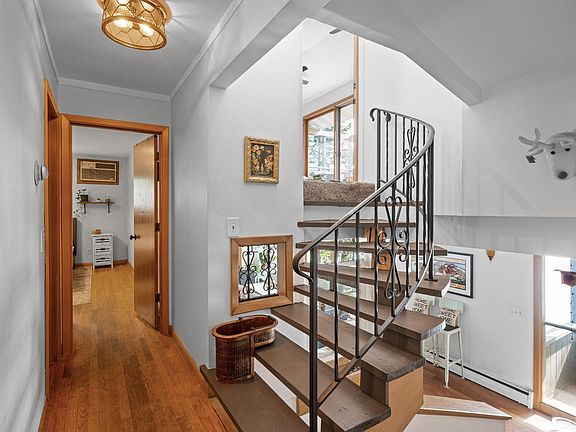 Relaxed up north living, just minutes from The Cities... Privacy and nature abound at this unique mid-century home on 126 feet of lakeshore with adjacent parkland. This expansive five-level residence has 5 bedrooms, including a spacious master suite with a private balcony on the top level. There are two kitchens, including a lower-level walkout kitchen for summer BBQs, and an upstairs kitchen/formal dining room with inspiring views and solid teak flooring. The lakefront is perfect for entertaining with a patio, firepit, hot tub and small sauna building, and there’s a double garage adjacent to the front entrance. With many renovations, updates and artistic touches, as well as some original MCM features, this home is ready for immediate summer enjoyment—and filled with potential.