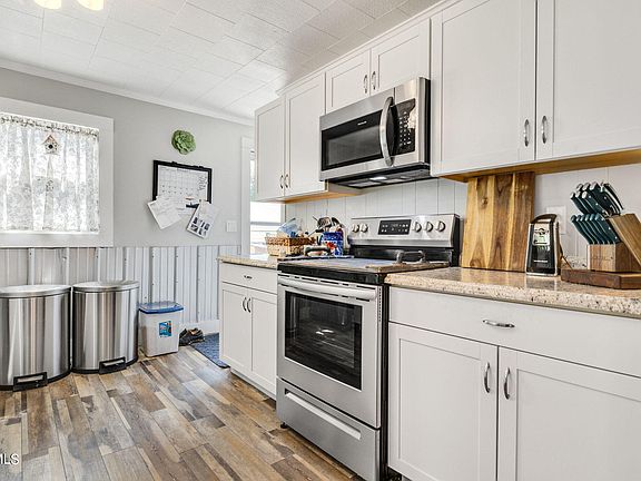 Freshly updated and ready to move right in! Sweet 2BR/2 bath cottage is all set up for your easy living. Fully fenced yard in both the front and back, with woods behind for privacy. Covered front porch welcomes you in, the living room and dining room are open concept. Gleaming hardwood floors, arched doorways, and WOW what a kitchen! White cabinets look crisp and are newer, take in the BIG window above the sink. Kitchen has a door leading to the carport outside for easy grocery unloading. Just beyond the large dining area is the screened porch, so nice, and perfect for just about year round use. Downstairs finds the unfinished basement that has another bathroom, laundry and is currently set up as another living space. Options! Roof is newer, heat pump is newer, all kitchen appliances stay with the home, all that is missing is you!