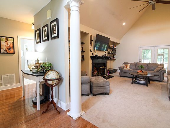 Gas log fireplaceFive acresSplit bedroom planScreened-in porchCathedral ceilings