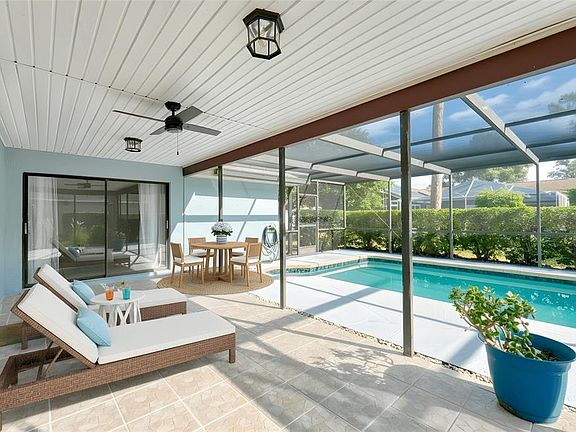 One or more photo(s) has been virtually staged. Updated and Move-In Ready in Fairway Forest NEW KITCHEN, NEW FLOORS throughout, and LOW HOA fees of just $200 per year. This 3-bedroom, 2-bathroom, 2-car garage pool home in Palm Harbor is completely updated and ready for you—and it's not in a flood zone. ROOF 2018, five HURRICANE-RATED WINDOWS (2022), and NEW HURRICANE-RATED GARAGE DOOR plus NEW SIDE GARAGE DOOR. At 1,685 square feet, this single-story home in Fairway Forest has everything you've been looking for. The split floor plan gives everyone their own space while keeping the vibe open and easy. Let’s talk about what just happened here: a complete transformation. BRAND NEW KITCHEN with white cabinets, QUARTZ COUNTERTOPS, TILE BACKSPLASH, STAINLESS STEEL APPLIANCES, and a CENTER ISLAND with abundant storage. NEW STAINLESS STEEL FRIDGE and NEW DISHWASHER included. And the FLOORS? Completely NEW throughout the entire home, installed just this November. FRESH PAINT in the living/dining room and primary bedroom gives those spaces a crisp, clean feel. This place is move-in ready in the best possible way. The family room has a WOOD-BURNING FIREPLACE for those cooler Florida nights, and then you step outside to the SCREENED POOL with a large covered lanai. The pool was RESURFACED three years ago with NEW DECORATIVE TILE added around the edge, so it’s ready for weekend pool parties and relaxing afternoons. The EXTERIOR WAS PAINTED at the same time, so the whole package looks sharp. The primary suite is your private retreat with an ensuite bathroom featuring a TILED WALK-IN SHOWER and MARBLE COUNTERTOP. Bedrooms two and three are both oversized and share the second full bathroom. No CDD fees eating into your budget every month. The schools here are excellent, and Fairway Forest is one of those Palm Harbor neighborhoods known for its community feel. FLAMINGO FRIDAYS are a tradition, and Santa makes an appearance during the holidays. It’s the kind of place where neighbors connect and the streets are lively with activity. This is the full package—updated, practical, in a great neighborhood, and priced right. Don’t wait on this one.