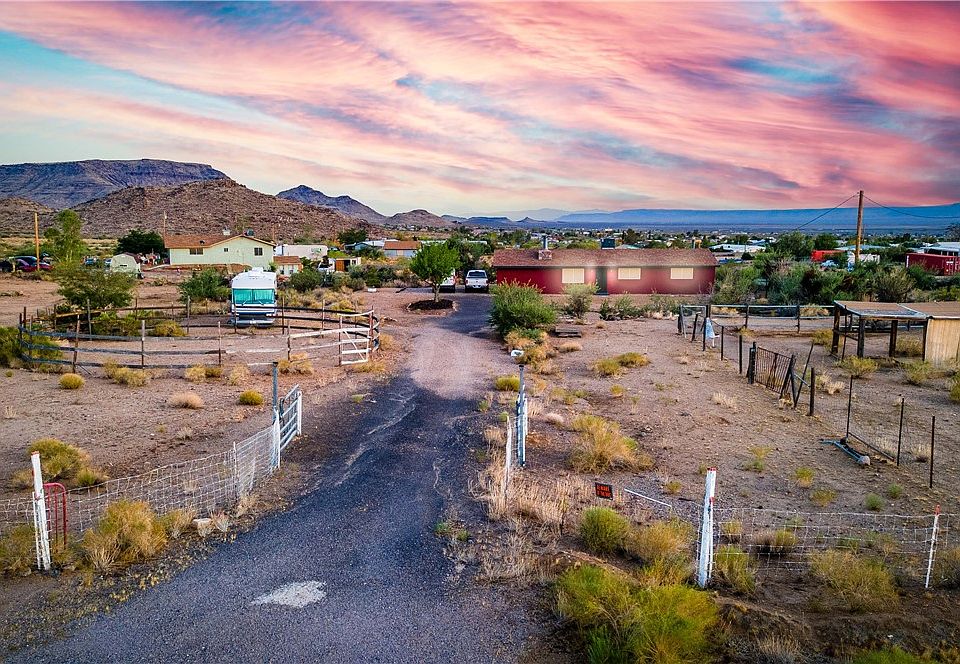 Easy access between Kingman & Las Vegas! Enjoy this 1.04 ranch style home for the upcoming holidays, Bring the horses & Chickens this property is zoned M- AR Agricultural Res. Cozy woodburning double side brick fireplace with a specious master suite with walk in closet, + Bonus room currently being used as a living room. Skylights for natural light. Plenty of room for the RV as well. Enjoy the stunning panoramic views without being too far from town. Rural water, power & septic! Bonus feature ... Property has a well (currently not being used) This property may possibly be rezoned too commercial. This a great property if you are seeking the best both worlds of living remote yet have the comfortable necessities.