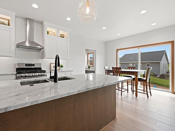 This open-concept, split-bedroom layout features a stylish kitchen with solid surface countertops, a large center island, and a walk-in working pantry complete with counter space and ample shelving for organized storage. Luxury vinyl plank flooring extends from the foyer through the great room, kitchen, and dinette, offering both durability and modern appeal. The great room showcases a cozy gas fireplace, while the primary suite features bath with quartz countertops, dual sinks, a tiled walk-in shower, and a generous walk-in closet. An open staircase leads to the full lookout lower level, offering excellent potential for future expansion or personalized finishing. Additional highlights include 1st floor laundry, direct basement access from the garage. Photos of similar home.