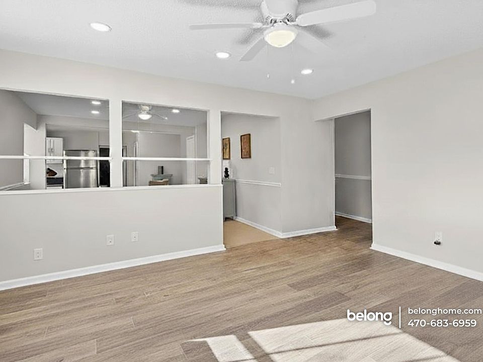 Natural light pours into your living area, creating a warm and welcoming setting where you can relax or host with ease. Recessed lighting and ceiling fans add comfort, while large windows frame views of the trees just outside, giving the room a bright and airy character.