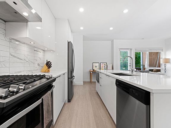 West coast modern unitStainless steel appliancesGas stoveQuartz countersLarge oversized island