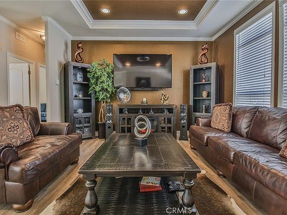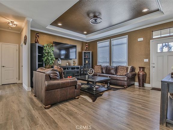 Turnkey 3-Bed, 2-Bath Home with Finished Garage & Owned Solar in Gated Community! Breathtakingly gorgeous luxury home with immaculate 2-car finished garage, owned solar system for energy efficiency (includes transferable warranty), and beautiful backyard oasis in all nestled prime location in coveted gated community. Built in 2017, this beautifully upgraded single-level home offers 3 bedrooms, 2 bathrooms, and luxury living in a secure, resort-style gated community. Featuring 10-ft ceilings, crown molding, recessed lighting, and coved ceilings, the open floor plan feels bright, airy, and upscale. Designer paint, stylish flooring, and ceiling fans add to the home's elegance and comfort. The spacious great room is filled with natural light and flows seamlessly into the dining area and chef’s kitchen, which features custom cabinetry, gleaming countertops, a center island with outlet, and a modern glass display cabinet. Stainless steel appliances are included: refrigerator, dishwasher, microwave, stove, oven, and a deep farmhouse sink with upgraded faucet. A striking chandelier elevates the dining experience. The private primary suite offers a peaceful retreat, complete with a bonus sitting area—ideal for an office, vanity, or lounge. The en suite bathroom includes a soaking tub, walk-in shower, and dual vanities with ample counter space. Two additional bedrooms are generously sized and share a well-appointed full bathroom with dual sinks and shower/tub combo. A dedicated laundry room provides extra storage and side-by-side washer/dryer hookups. This energy-efficient home includes an owned solar system, producing enough power for both the house and the garage. Car lovers and hobbyists will appreciate the immaculate finished 2-car garage with epoxy floors, insulated auto door, and finished walls—perfect for a gym, workshop, or flex space. The backyard is designed for both relaxation and entertaining, with a gated play area, expansive patio, and oversized custom driveway with durable coating. Crisp white vinyl fencing adds privacy, and low-maintenance landscaping ensures easy upkeep. Located in the heart of a 24/7 guard-gated community, residents enjoy top-tier amenities: resort-style pool and spa, playground, fitness center, sports court, and more. Perfectly maintained and ideal for all lifestyles, this home blends modern style, comfort, and efficiency in a prime location. Don’t miss your chance—schedule your private showing today!