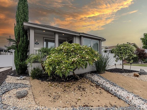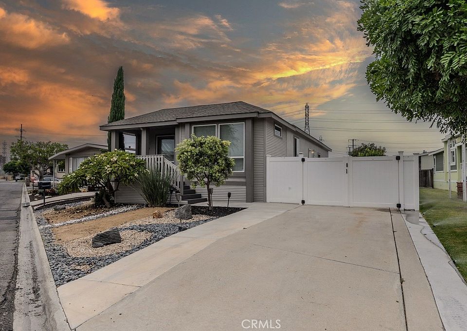 3595 Santa Fe Ave #278, Long Beach, located in Windward Village, a community of manufactured homes with land ownership. Built in 2017, this three-bedroom, two-bath home is set on one of the largest lots in the community at 5,719 square feet. Positioned on a corner lot for added privacy, it features a covered front porch and landscaped entry that create strong curb appeal. A wide driveway, plus gated side parking for up to four cars, adds versatility. Inside, the entry opens to a spacious great room where the living room, kitchen, and dining area connect under 9-foot ceilings with recessed lights, skylights, and laminate wood flooring. The kitchen features a waterfall quartz island with seating, a built-in microwave drawer, pull-out storage drawers, a stainless steel range with double oven, a pot filler faucet, a range vent, under-cabinet lighting, a farm sink, a walk-in pantry, and ample cabinetry. The dining area sits in a cove off the kitchen, while the living room offers a ceiling fan, built-in lower cabinets, and a stacked stone accent wall. The primary bedroom includes a ceiling fan, a walk-in closet with a solar tube, and a sliding glass door to the backyard. The en suite bath has dual sinks, stone counters, linen cabinets, a deep soaking tub, and a walk-in tiled shower with a seating bench. Two additional bedrooms offer carpet, ceiling fans, and wall outlets ready for mounted televisions. The guest bath includes a walk-in tiled shower with a seating bench and stone counters. The laundry room is inside, with cabinets for storage. The backyard is larger than typical for the community, with newer vinyl fencing for privacy, an automated sprinkler system, and ample space for outdoor seating or gardening. The front yard has a drip irrigation system, and the home includes an electric car charger. HOA amenities include gated entry with 24-hour security, clubhouse, pool and spa, tennis and basketball courts, fitness center, playground, RV storage, recreational areas, billiard room, and landscaped grounds. HOA dues are $330 per month.