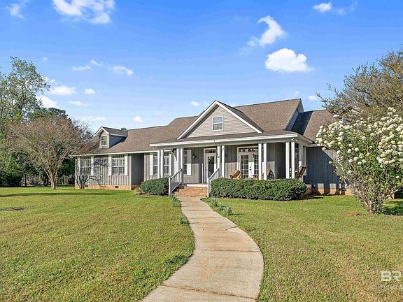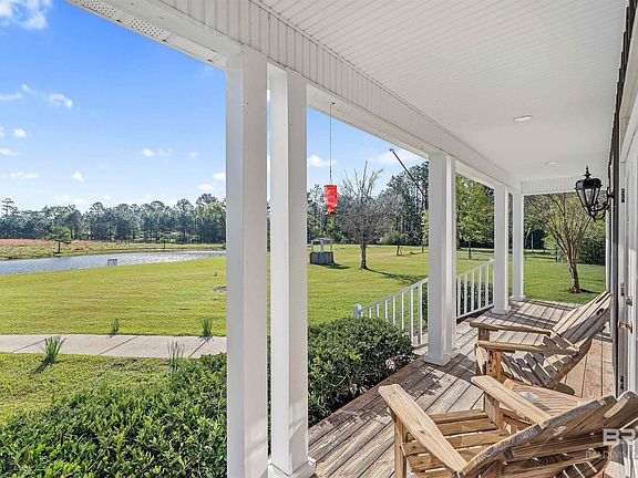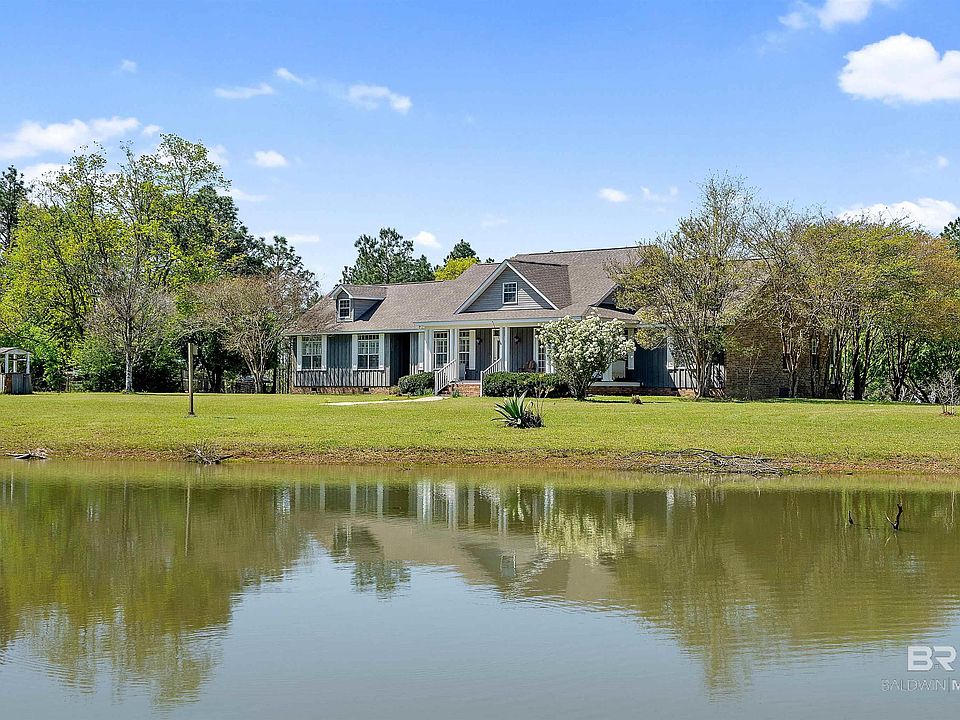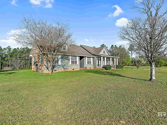 Welcome Home to 15.2 beautifully fenced acres with a Beautiful 3 bedroom 3 bath house with 2688 sq ft. This stunning upscale home sits on 9.2 acres, with an acre stocked pond, and is being sold with an additional 6 acres (PPIN#'s 23104/23105). The home offers 3 bedrooms 3 baths with a bonus room, sewing room and study/office. Kitchen has granite countertops, plenty of cabinet space, and is wide open to the dining room and large living room with woodburning fireplace. The private primary bath is equipped with a soaking tub & double vanity. There is an all glass back porch with a 2 car carport. The view from the covered front porch overlooking the pond is priceless. The home has 2 wells & the roof is Bronze Fortified and installed in 2019. The Location is perfect with only 15 miles to I10, 25 miles to I65, about an 1 hour to the beach, about 25 minutes to Mobile Al, 51 miles to Pensacola Fl. Don't Miss out on this one.