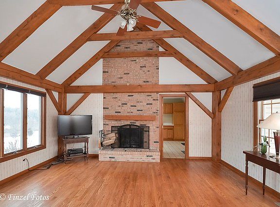 SO MUCH CHARACTER HERE! BRAND NEW ROOF TOO! This 4 bedroom home is located on a SPACIOUS 1+ acre pond-view lot. Enjoy the upper and lower decks to fully take advantage of this beautiful backyard. Inside you'll find VAULTED ceilings, WOOD BEAMS, skylights, hardwood floors, multiple FIREPLACES, updated kitchen and bathrooms. Kitchen cabinets have soft-close doors, GRANITE counter tops, updated appliances, built in microwave and oven, under mount sink and beautiful backyard views. First floor laundry is located in the large MUDROOM with access to the backyard and garage. First floor master bedroom retreat has VAULTED CEILINGS and fireplace. Second floor bedrooms have character too! One with SKYLIGHTS and another with BRICK accent wall. Fully finished basement with a full bathroom, bonus room and a cedar closet. The basement has a sliding door to access the huge lower level deck. What a great space to entertain or extra living area. Clean and move in ready!