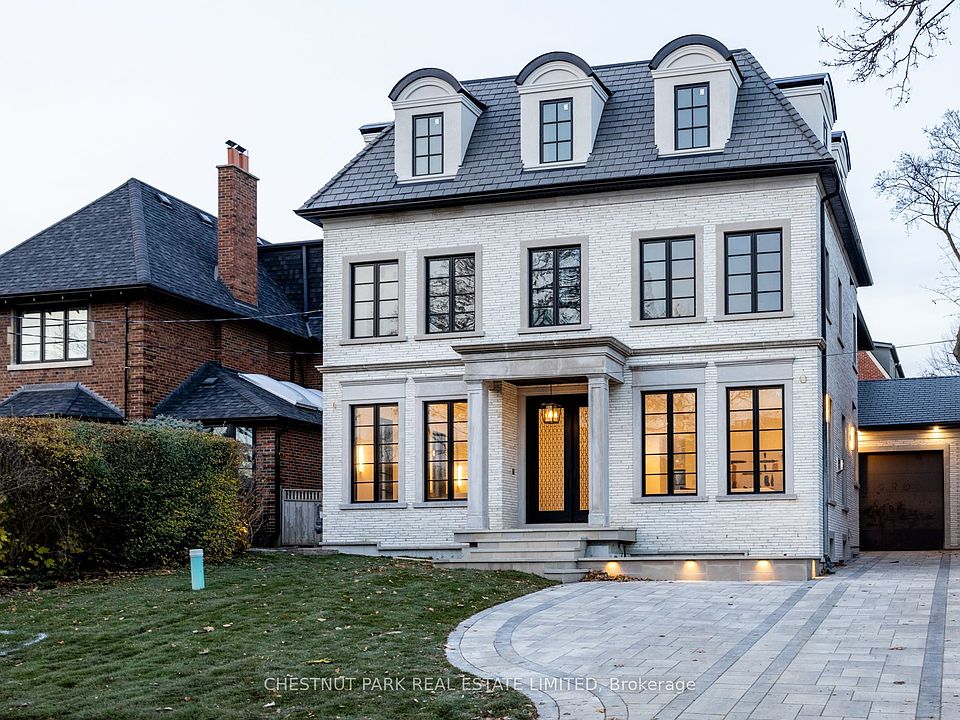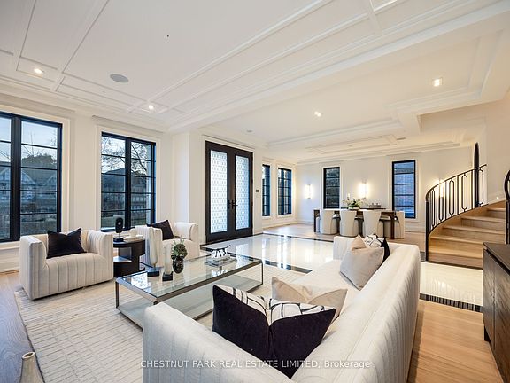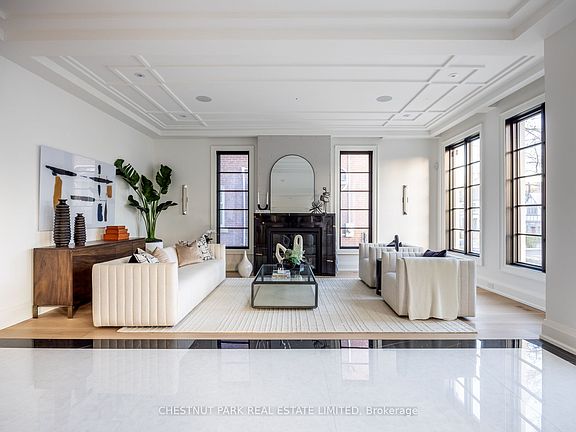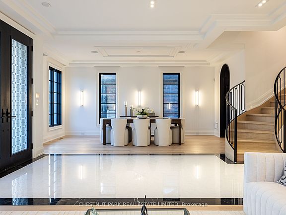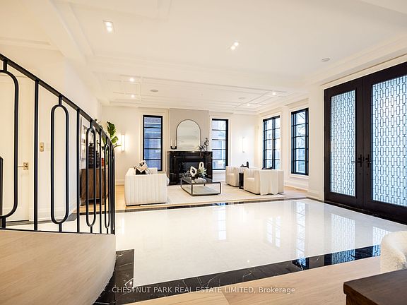 A newly built custom residence, designed by Spragge Architects, is perfectly positioned with southern exposure and captivating winter city views. Exemplifying exceptional craftsmanship in the heart of prestigious Forest Hill. This 6-bedroom, 8-bathroom home spans over 5,200 sq ft of refined living space, blending timeless artistry with the finest materials. From the moment you arrive, a heated walkway leads to an impressive entrance framed by a brick and Indiana limestone facade. Inside, soaring 10.5-foot ceilings, a sweeping curved staircase, and a grand stone hallway set a tone of understated elegance. The formal oversized living and dining rooms feature coffered ceilings, a statement fireplace, and a butler's pantry designed for seamless entertaining. Sunlight fills the principal rooms, overlooking manicured gardens and a saltwater pool, while a private elevator offers effortless access to every level. Enter through the private side entrance from the driveway into a well-appointed mudroom that combines function and style, adjacent to a striking powder room with marble floors and an integrated marble sink. The chef's kitchen, anchored by a generous eat-in island and breakfast area, connects to a welcoming family room with custom built-ins, a coffered ceiling, and a walk-out to the private yard. Upstairs, the Primary suite offers a tranquil retreat with a private balcony, custom walk-in closet with exquisite cabinetry, and spa-inspired ensuite. Two additional bedrooms, each with designer finishes and ensuite bathrooms, complete this level. The top floor adds versatility with two more bedrooms, a full bath, an office or play space, and a sunlit laundry room with abundant storage. The lower level impresses with a large recreation room, wet bar, gym, guest/nanny suite, powder room, and ample storage & radiant heating. Just steps from Forest Hill Village, Cedarvale Park, and only 15 minutes to Yorkville. Thirty-Six Ava Road defines modern luxury and effortless living.
