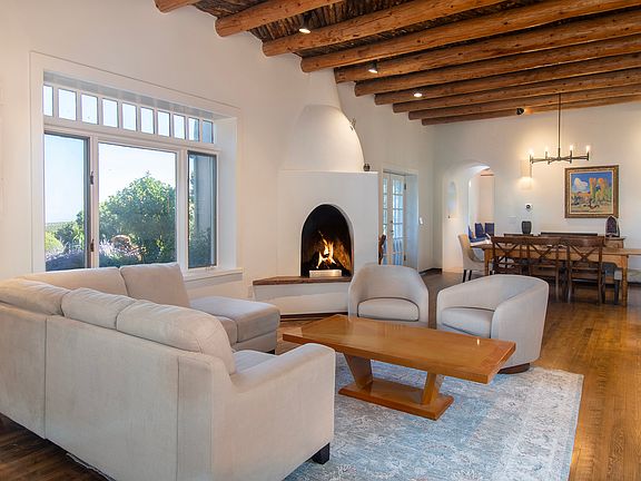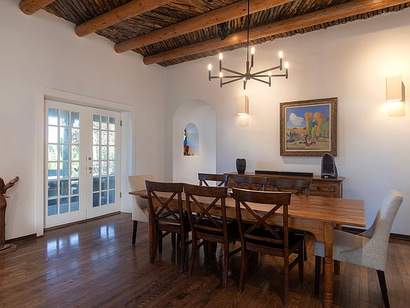 Located next to the iconic Bishop's Lodge Resort, this property has been a cherished family sanctuary for over 100 years. Recently remodeled in a timeless Pueblo Revival style, the home seamlessly blends a clean modern aesthetic and amenities with traditional Southwestern charm. The residence is a double adobe passive solar home designed by renowned architect/artist William (Bill) Lumpkins and built by local artisans of the time.
