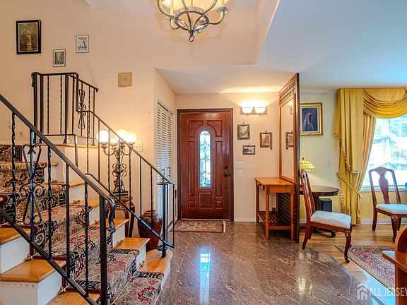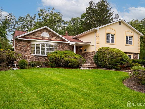 This custom multi-level home located on one of the most desirable streets in North Edison offers beautiful curb appeal with its stucco and stone facade, professional landscaping, and paving-stone walkways and driveway. Upon entering into the large entry foyer with marble flooring, one will find the living room to the left with hardwood flooring and a bay window. There is also a stunning great room with a vaulted open-beamed ceiling on this level. It consists of a formal dining area and recreation area featuring a brick wall with woodburning fireplace, perfect for entertaining. Completing this level is the gourmet eat-in kitchen with stainless-steel appliances, double wall ovens, large stovetop range with exhaust hood. Up a short flight of stairs is the bedroom area. There you will find the primary en suite bedroom, three additional nice-sized bedrooms as well as the main bathroom. Hardwood flooring can be found in the hallway and some bedrooms. The lower level offers a flex room with brick flooring, which can be used as an office, playroom, den, or as desired. There is a powder room on this level, access to the driveway, and access to a lovely spacious three-season room overlooking the resort-like backyard with tiled-patio for outdoor dining; and a built-in swimming pool. In addition, the home has a finished basement with a custom spa featuring a sauna, steam room, shower, and large jetted-tub. The utility and laundry rooms can also be found on this level. The yard features professional landscaping, underground sprinklers as well as a fenced-in backyard. Only minutes away from local schools, restaurants, and shops. This custom home truly has it all! Close to major highways near to train and bus lines for commuting to NYC!