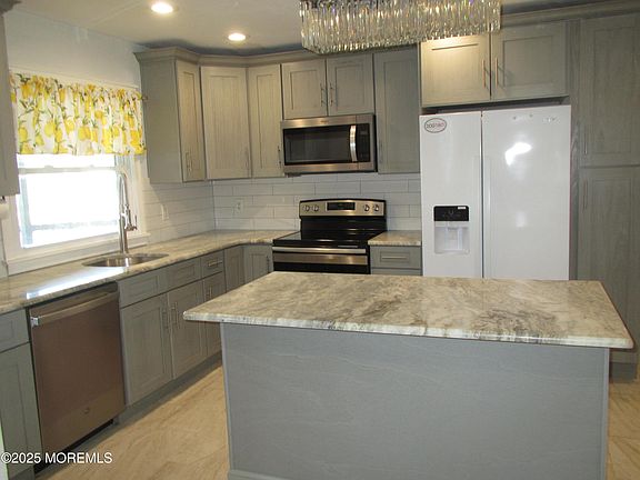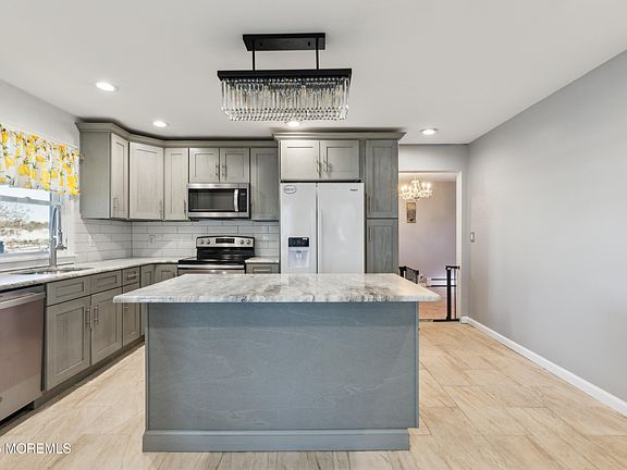 Waterfront Ranch w/1 car garage in the highly desirable Baywood Section of Brick. Located on a cul de sac. Newer driveway & walkway lined w/Belgian blocks. In-ground sprinklers, front & back. Automatic attic fan. Newer kitchen w/center island, recessed lighting & tile floor. Living Rm w/wood-burning fireplace,recessed lighting & tile floor. Stackable space saving washer/dryer. Bedrooms have ceiling fans & hardwood floors. Newer bath w/handicapped shower & toilet. Master Bath has a Jacuzzi tub. Office/Bonus Rm w/separate entrance. Updated furnace & hot water heater. Gazebo & roll out awning over large backyard deck. No damage from Sandy. Low flood insurance which as per seller is transferable to new owner.