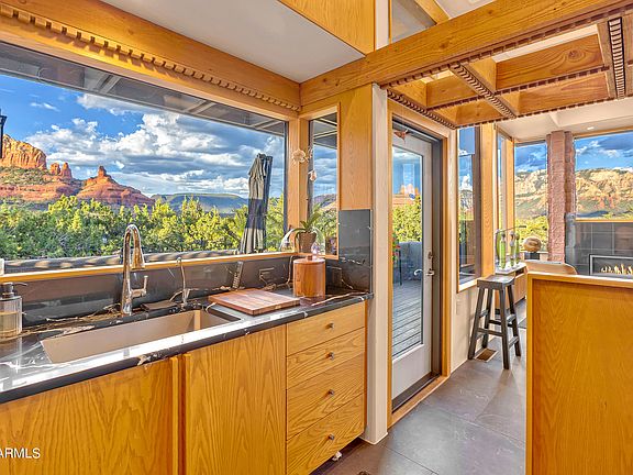 This home boasts two level living. Main level offers a living room that offers an unparalleled backdrop of Sedona's natural beauty, a serene quiet room, primary suite w/ the ultimate spa bath featuring a Japanese Soaking tub. The Thermador kitchen is a chef's dream, perfect for entertaining or indulging in quiet culinary creations. First Level Living includes a guest bdrm , guest bth, 3rd bdrm/office, and covered patio space. Need a space to unwind? Two view trex decks provide inspiring settings.