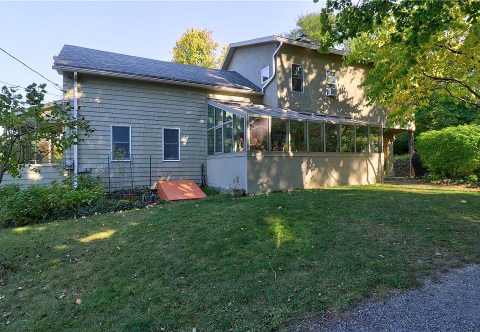 36 Court Street in Aurora offers comfortable village living just a short stroll from Cayuga Lake. This 3 bedroom, 2 bath home provides over 2,300 square feet of living space, perfect for those who appreciate room to spread out. Features include hardwood floors, several built-in bookshelves for the avid reader, and the convenience of second-floor laundry. Relax on the screened-in porch with your morning coffee, or enjoy the private backyard with its small cabin ideal for hobbies or extra storage. You'll also find two pawpaw trees and black currents in the backyard, and apple trees gracing the front yard. Inside, the home boasts beautiful tile work and a greenhouse that floods the space with natural light and passive solar heat. A wood stove is negotiable, adding a cozy touch for those chilly evenings. This property offers a blend of practicality, charm, and a convenient location. This home is a must-see! Please note that the listed square footage differs from public record and was measured by an appraiser.