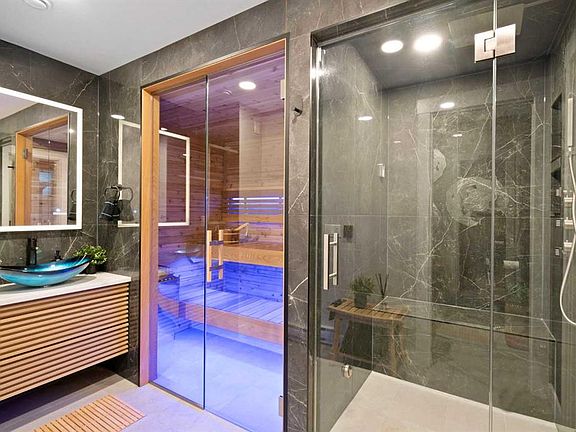 WELCOME HOME! Looking for an elevated lifestyle experience? Your opportunity is here! Nestled in the prestigious Riverstone in Cranston, this executive 2 storey home offers over 3620 sq. ft. including a fully developed basement, all backing onto complete privacy with no neighbours or pathways behind. Situated on a quiet cul-de-sac surrounded by untouched green space, this is a rare setting where luxury and nature meet. From the moment you enter, a wall of windows along the rear of the home frames uninterrupted greenspace views, filling the interior with natural light. The main floor boasts 9’ ceilings, luxury vinyl plank flooring, and a seamless open-concept design. The chef’s kitchen is a masterpiece featuring ceiling-height cabinetry, quartz countertops, a herringbone backsplash, premium stainless steel appliances including a wall-mounted oven and gas cooktop, a massive island with breakfast bar, and a walk-through pantry. The dining and living areas blend beautifully, complemented by a tile-surround gas fireplace, while a front flex room provides the perfect home office. Upstairs, the wrought-iron staircase leads to a bonus room overlooking the backyard views, along with 4 spacious bedrooms. The primary retreat is a true sanctuary with a spa-like ensuite offering dual sinks, quartz counters, a glass shower, and a freestanding soaker tub. The upper level is completed by a designer laundry room with built-ins, front-load appliances, and decorative tile flooring. The professionally developed basement with 9’ ceilings is designed for an elevated lifestyle. A private theatre room with custom built-ins and bar fridges creates the ultimate entertainment zone, while the glass-enclosed home gym with professional flooring offers a space to recharge. Off the gym, you’ll find a private wellness retreat featuring a full sauna and steam shower, creating the ultimate at-home escape! Modern comforts extend throughout the property, including full central air conditioning, a smart lighting package in the basement, and an impressive Gemstone exterior lighting system that elevates the home’s curb appeal year-round. Outdoors, the escarpment is your personal backdrop. Enjoy coffee in your huge yard, evenings watching wildlife, or children playing in the quiet yard. Just steps to the Bow River pathways and minutes to schools, shops, restaurants, South Health Campus, and major routes. Book your showing today, you are going to love this home!