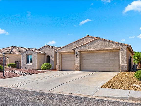 MOTIVATED SELLERS - BRING ALL OFFERS! Looking for that spectacular GOLF COURSE gated community home with BOAT DEEP garage? Look no further than this exquisite home located in the gated golf course community of El Rio. This home sits on the #1 hole of this spectacular designed golf course & offers panoramic views from every angle inside & outside this home. This 1890 sf 3 bed + den, 2 bath home has features throughout that is going to leave you speechless. Exceptional curb appeal jumps out the moment you set your eyes on this property with its lush desert landscape & covered front entry. Step inside this open concept/split floor plan designed home & be greeted by tile plank flooring & plush carpet throughout. With vaulted ceilings & plenty of windows allowing all that natural light in, this home is spacious & is the perfect entertaining property. The kitchen boasts stainless appliances, granite counters, kitchen island breakfast bar, tiled backsplash, pantry, & casual dining space. The primary suite is tucked away for added privacy & features a tray ceiling, & views of the golf course from your bed, while the primary en-suite bathroom is simply elegant with its granite top dual sink vanity, tiled walk-in shower, & walk in closet. The two guest bedrooms are spacious in size, & one of the guest bedrooms even features a walk-in closet. The guest bathroom too has a granite counter vanity & a tub/shower combo. This home even has a den which could be utilized as that home office you were always dreaming of. Custom window treatments, ceiling fans throughout, water softener/ro drinking water system, & an in-house laundry room round out the exceptional features on the inside of this lovely home. If you need room for those desert & water toys, this home has you covered with its insulated garage equipped with a mini split ac/heat unit & epoxy floor. This 3-car garage will even fit your boat as it is 45' deep & has 8' tall garage doors. Take the party outside into your backyard & enjoy the gorgeous year-round Arizona weather from the comforts of your full-length backyard covered patio space. Enjoy what this gated golf course community has to offer as you are walking distance to the 1st tee & can enjoy that after round cocktail at the El Rio clubhouse. Located minutes to the Laughlin casinos, the Colorado River, Lake Mohave, restaurants, shopping, & fun.