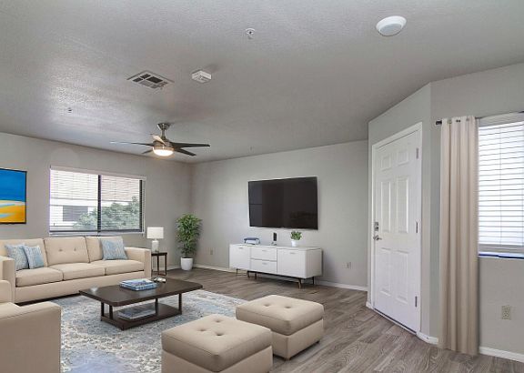 1 month FREE rent when signing an 18 month lease. Check out this upgraded 3 bed, 2 bath apartment right in the heart of Downtown Gilbert. You're steps from OHSO, Culinary Dropout, Whiskey Row, Snooze, Joyride, and more. Inside, you've got quartz counters, a sleek tile backsplash, stainless-steel appliances, modern white cabinets, updated flooring, and LED ceiling fans in every room. The place has a clean, urban vibe with all the comforts. The community has a pool, covered parking, and you'll be walking distance to everything. Resident covers all utilities.