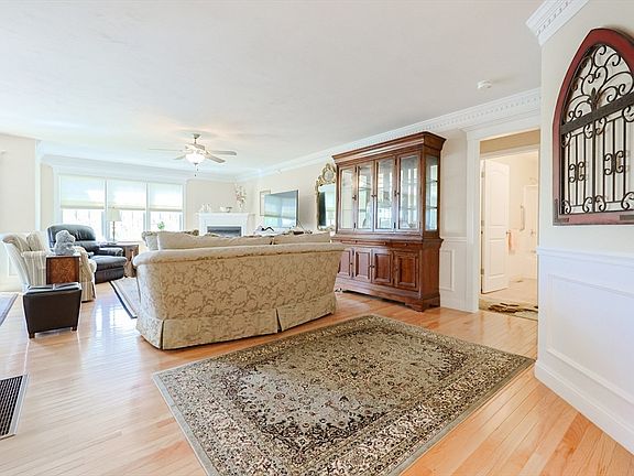 This immaculately maintained 2-bed, 2 full bath, one-level home is absolutely stunning and will impress even the most discriminating buyer. Oversize foyer w/large closet leads to open floor plan highlighted by gleaming hardwoods, crown & dentil molding, wainscoting, and custom built-ins. Gas fireplaced living room flows seamlessly into dining area and updated kitchen with gorgeous countetops & breakfast bar seating. Double windows provide tons of natural light. Multiple closets feature great storage throughout. Primary bedroom has a gorgeous palladium window, cathedral ceiling, a 6x15 walk-in closet, and ensuite bath with a walk-in shower. Second bedroom is also oversize with a double closet. Exterior rear deck is upgraded to composite with a motorized SunSetter Awning. Basement has potential for finish with full-size windows and French Doors leading to rear patio. Front porch and two-car attached oversize garage. Pride of ownership is evident; seller is original owner of this home.