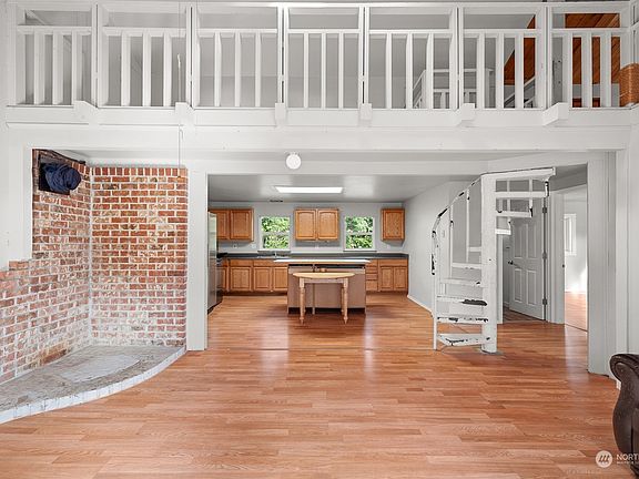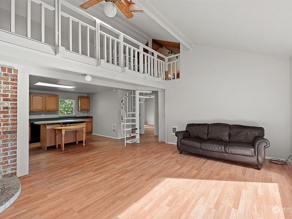 Looking for your tranquil getaway? This 5-acre property with peaceful home in Hoquiam is surrounded by trees and offers 2 bedrooms, 1 bathroom, and 1052 sqft of living. Bright and open main living area features vaulted ceilings with views to the loft style second floor and spiral staircase. Kitchen is situated below with ample storage, island seating, and convenient attached garage entrance. You'll also find a custom tiled full bath, primary bedroom with incredible views of the back yard from the private covered deck, and great sized second bedroom on the main floor. Tons of possibilities above with built in storage, and partial T&G ceilings! The property offers open yard for all to enjoy and wrapped in old growth for natural seclusion.