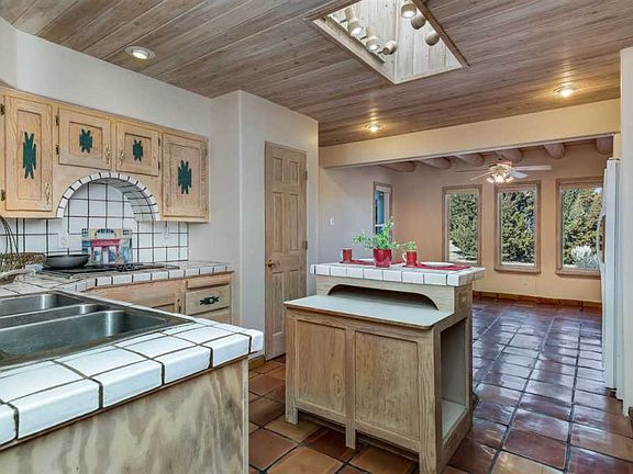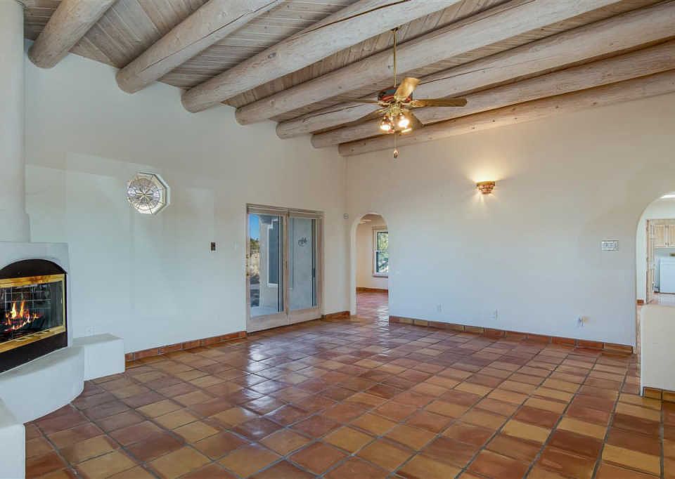 A welcoming Portal beckons you into this spacious home on a Corner Lot just off of pavement. Home features Saltillo tile, Vigas throughout, Kiva style fireplace, nichos, custom cabinetry, and great views! Floor plan is open and spacious offering good bedroom separation. Master Suite features French Doors that open to expansive back yard with covered patio that offers Excellent Sangre Views. Master bath has jetted tub and huge walk in closet. Newer stucco, newer windows with virtually indestructible Crim window screens throughout, in floor radiant heat, oversized garage, and spacious laundry room add additional perks. Eldorado is one of the nicest, friendliest neighborhood anywhere and is home to home to miles and miles of walking and bike trails, acres of wilderness preserve, K-8 school, summer time pool, library, shopping, dining, and Divine Night Skies. Come see The Milky Way from either of your two portals. A country feel yet, only about 20 minutes to the Santa Fe Plaza!