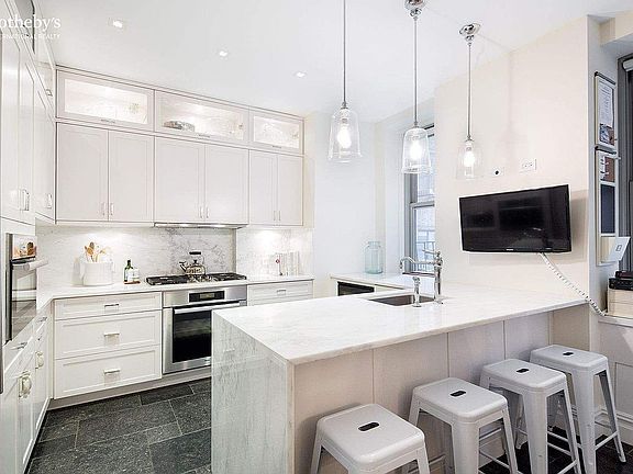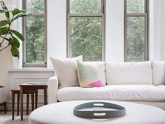 The living room features a decorative fireplace and offers a stunning view of the park. The windowed eat-in kitchen features Miele appliances, a Sub-Zero refrigerator, a wine cooler, and honed marble countertops and backsplash.